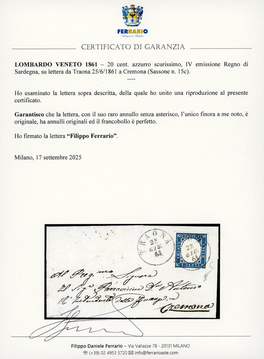 TRAONA, cerchio semplice senza asterisco (inedito) punti 12 - 20 cent. (Sardegna 15c), lieve piega orizzontale, su lettera del 25/6/1861 per Cremona. Molto rara, unico caso finora noto di questo annullo senza asterisco. Cert. Ferrario.