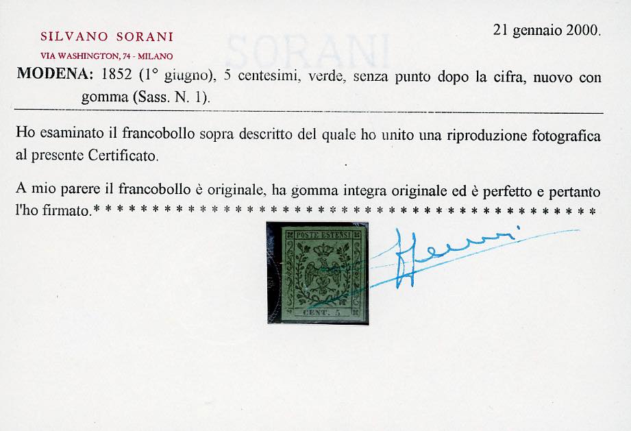 1852 - 5 cent. verde, senza punto dopo le cifre (1), gomma originale integra, perfetto. Splendido e raro in queste condizioni. G.Bolaffi, A.Zanaria, cert. Sorani.
