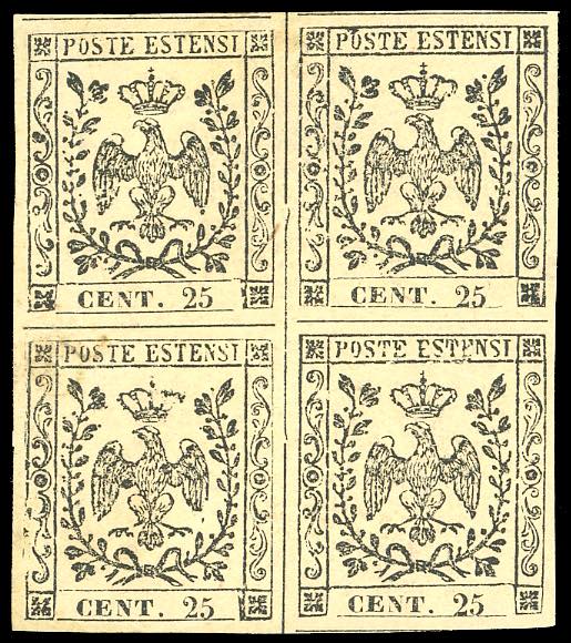 1852 - 25 cent. camoscio chiaro (4), blocco di quattro, gomma originale, integra per tre esemplari, perfetto. A.Diena, Ferrario.