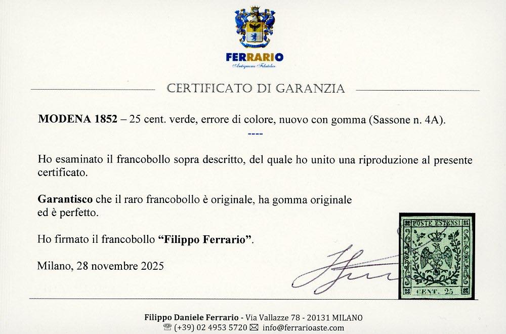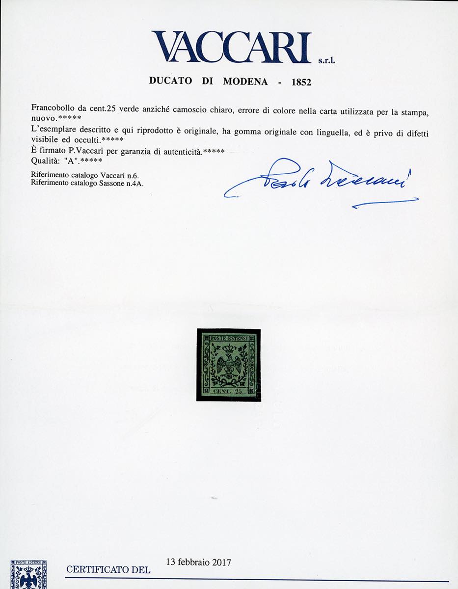 1852 - 25 cent. verde, errore di colore (4A), nuovo, gomma originale, perfetto. Molto raro. Cert. Vaccari e Ferrario.