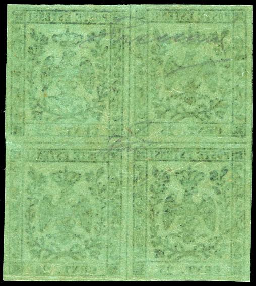 1852 - 25 cent. verde, errore di colore (4A), blocco di quattro, perfetto, gomma originale integra, perfetto. E' uno dei pochissimi blocchi ... Leggi tutto