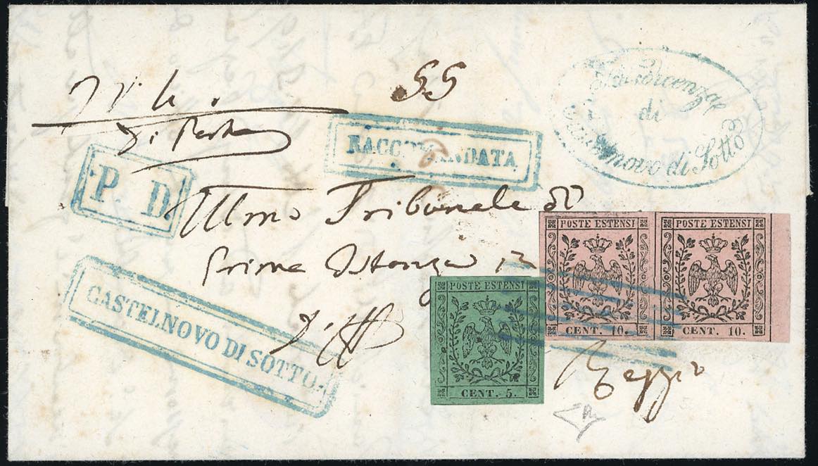 1858 - 10 cent. rosa, coppia orizzontale, bordo di foglio, un esemplare con varietà tipografica punto grosso dopo la cifra, perfetta, e singolo al verso (danneggiato all'apertura), 5 cent. verde, perfetto, tutti con punto dopo le cifre (9,7), su lettera raccomandata da Castelnuovo di Sotto 16/1/1858 (punti 12) a Reggio. Insieme probabilmente unico, di eccezionale freschezza. Cert. E.Diena.