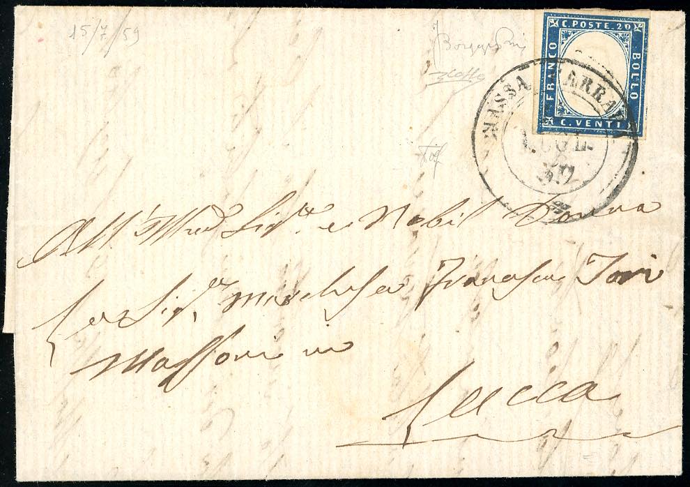 1860 - 20 cent. IV emissione di Sardegna (15Ba/C3), perfetto, su lettera da Massa Carrara 15/7/1859 a Lucca. Rara lettera dall'Oltreappennino Modenese in periodo di Governo Provvisorio. Molto fresca. Bargagli, cert. Colla.