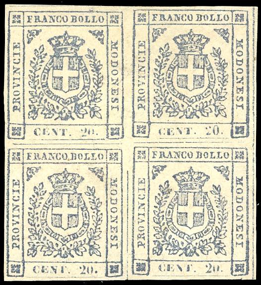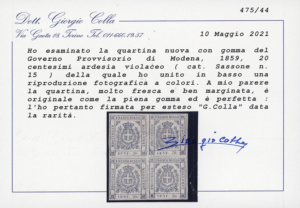 1859 - 20 cent. ardesia violaceo (15), blocco di quattro, nuovo, gomma originale, integra per i due esemplari inferiori, perfetto. Raro. E.Diena, Raybaudi, cert. Colla e Ferrario.