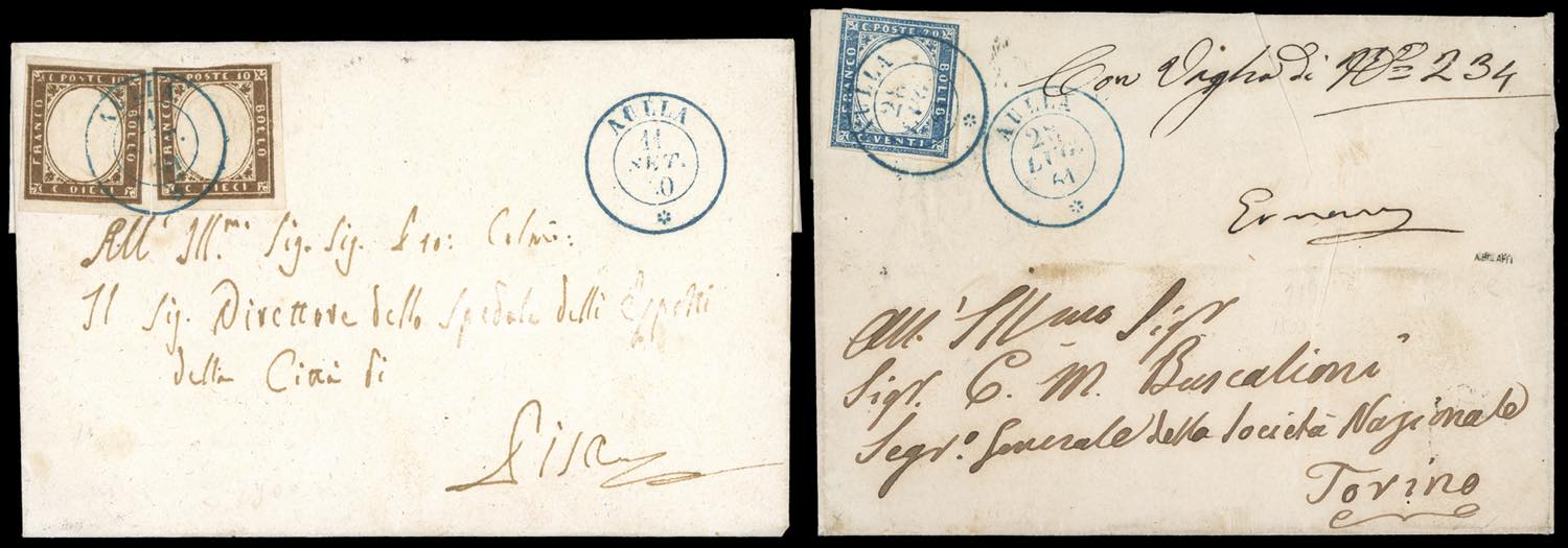 AULLA, sardo italiano in azzurro punti 6 - 10 cent. bruno grigio olivastro IV emissione di Sardegna (14B), due esemplari, uno perfetto, l'altro corto in alto, su lettera del 11/9/1860 per Pisa; 20 cent. IV emissione di Sardegna (15D), perfetto, su lettera del 28/7/1861 per Torino, sul fronte l'indicazione che conteneva un vaglia postale.