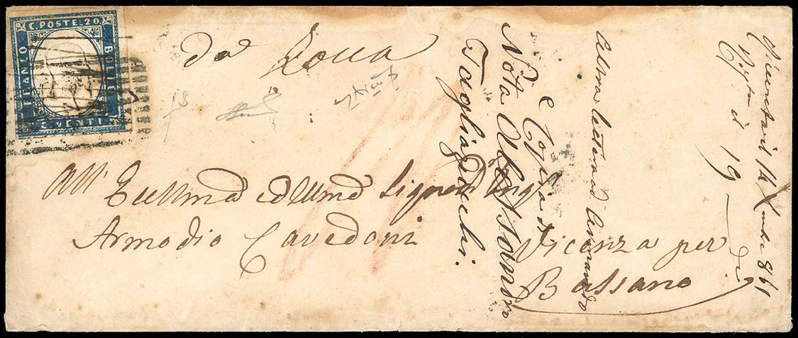 ZOCCA, manoscritto punti R3 - 20 cent. IV emissione di Sardegna (15Dc), perfetto, su busta per Bassano 15/12/1862, tassata 10 soldi in ... Leggi tutto