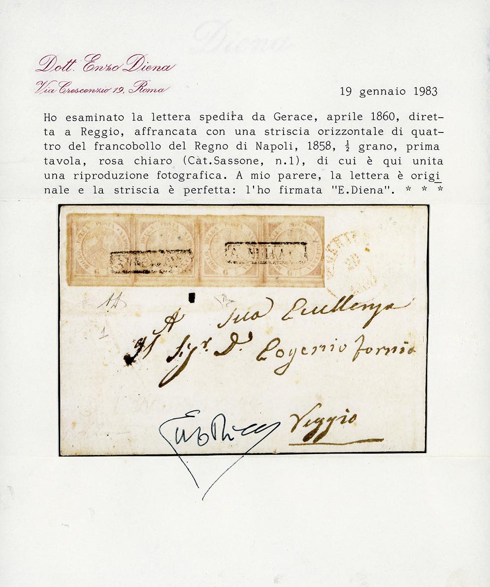 1860 - 1/2 grano rosa chiaro, I tavola (1), striscia di quattro, perfetta, su lettera da Gerace a Reggio, bollo di arrivo del 29/3/1860. A.Diena, cert. Enzo Diena.