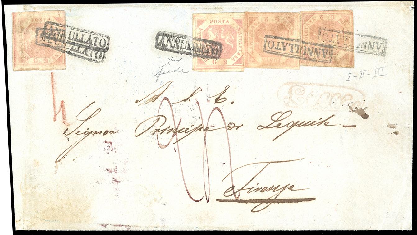 1858 - 2 grana rosa brunastro, III tavola, 2 grana rosa lillaceo, I tavola, entrambi già annullati e riutilizzati in frode postale, 2 grana rosa brunastro, II tavola, due esemplari (7,5a,6b), su lettera da Lecce, transito di Napoli del 15/11/1858 a Firenze, tassata 24 crazie. Malgrado l'affrancatura non sia completa, si tratta di UNA DELLE DUE AFFRANCATURE NOTE COMPRENDENTI LE TRE DIVERSE TAVOLE DEL FRANCOBOLLO DA 2 GRANA. Chiavarello. Ex coll. Imperato.