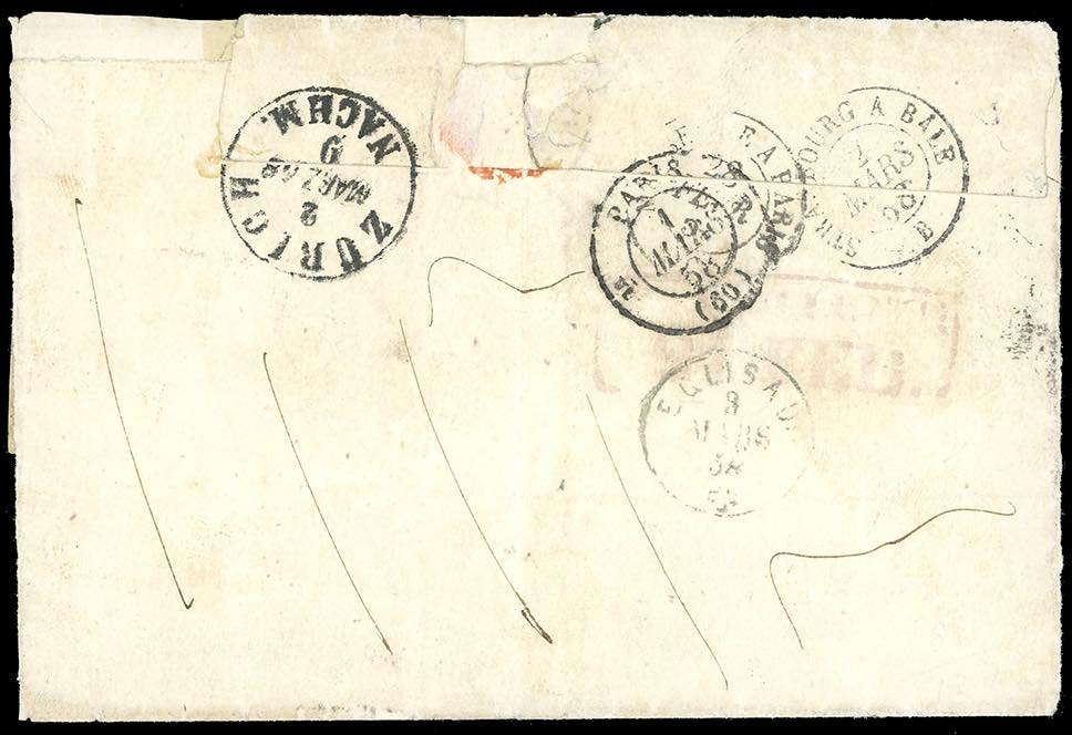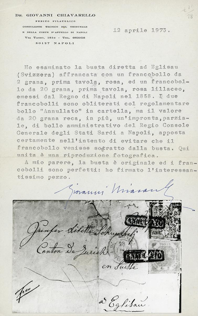 1858 - 20 grana rosa lillaceo, 2 grana rosa chiaro, entrambi I tavola (12a,5), perfetti, su lettera da Napoli 24/2/1858 ad Eglisau, in Svizzera. Il 20 grana reca anche un'impronta parziale del bollo amministrativo del Regio Console Generale degli Stati Sardi a Napoli, per evitare la sottrazione del francobollo dalla busta. Interessante "precursore" dei perfin, caso probabilmente unico nel Regno di Napoli. Dettagliato cert. Chiavarello. Ex coll. Imperato.