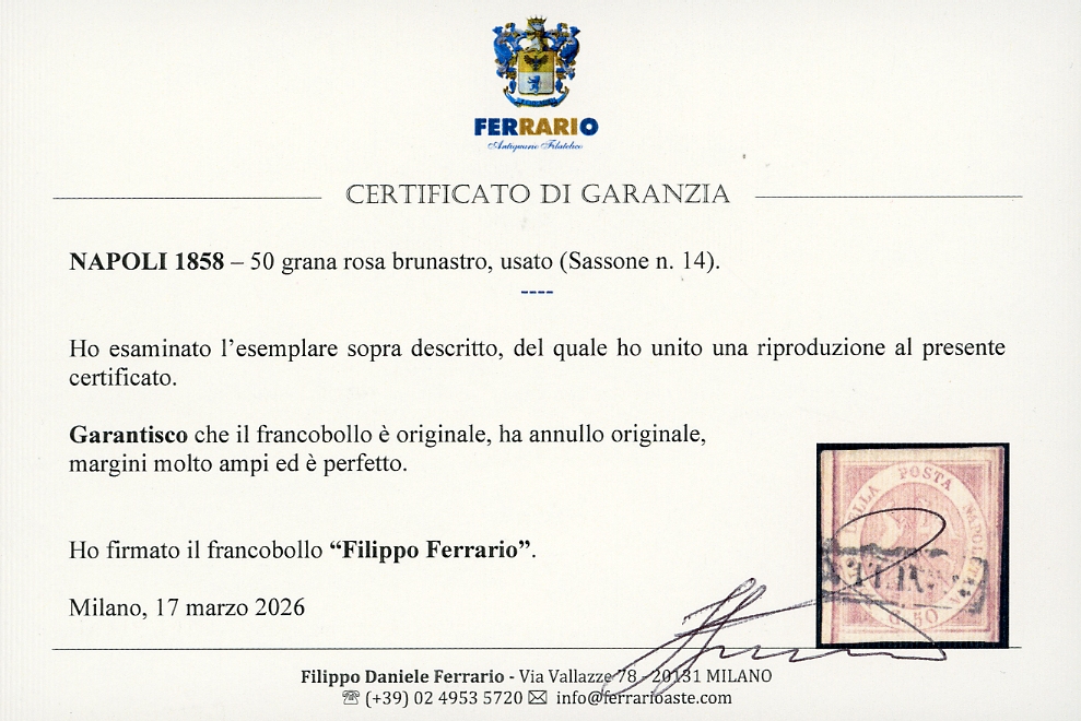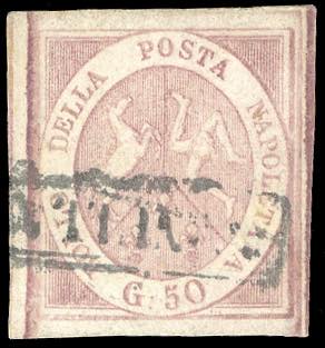1858 - 50 grana rosa brunastro (14), usato, perfetto, margini enormi, raro di questa qualità. Bellissimo. Emilio ed Enzo Diena, cert. Ferrario.