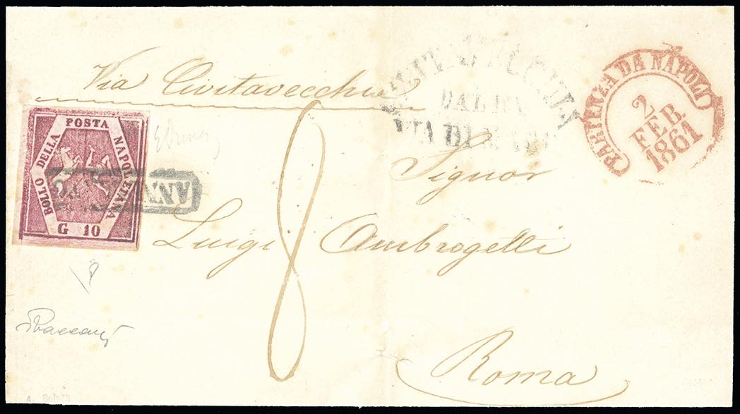 1861 - 10 grana carminio lillaceo, falso per posta del V tipo (F7), perfetto e di colore molto fresco, su lettera, in parte finemente restaurata, da Napoli 2/2/1861 a Roma, bollo "Civitavecchia dalla via di mare" e tassa di 8 baj sul fronte, datari di Civitavecchia e Roma al verso. Bella, ottimo aspetto, Em.Diena, Vaccari, cert. E.Diena.