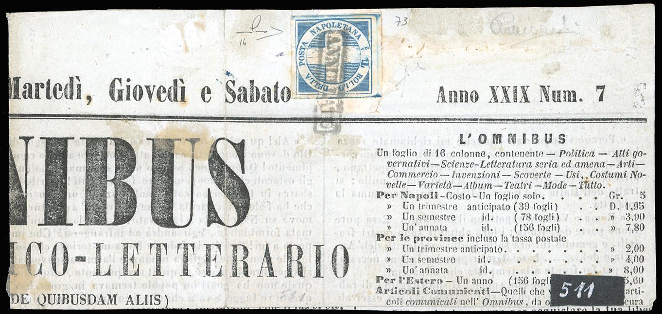 1861 - 1/2 tornese azzurro Crocetta (16), pos. 73 dello studio De Angelis-Pecchi, perfetto e ben marginato, usato su testata completa del giornale "L'Omnibus" del 15/1/1861. Mezzadri, cert. Fiecchi e Manzoni.