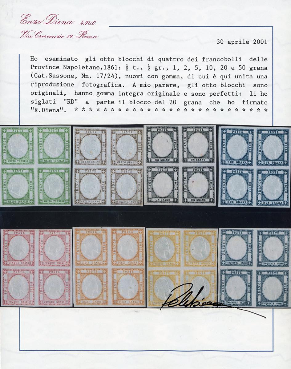 1861 - Serie completa (17/24), blocchi di quattro, nuovi, gomma originale integra, perfetti. Splendidi e rari. Cert. Diena.