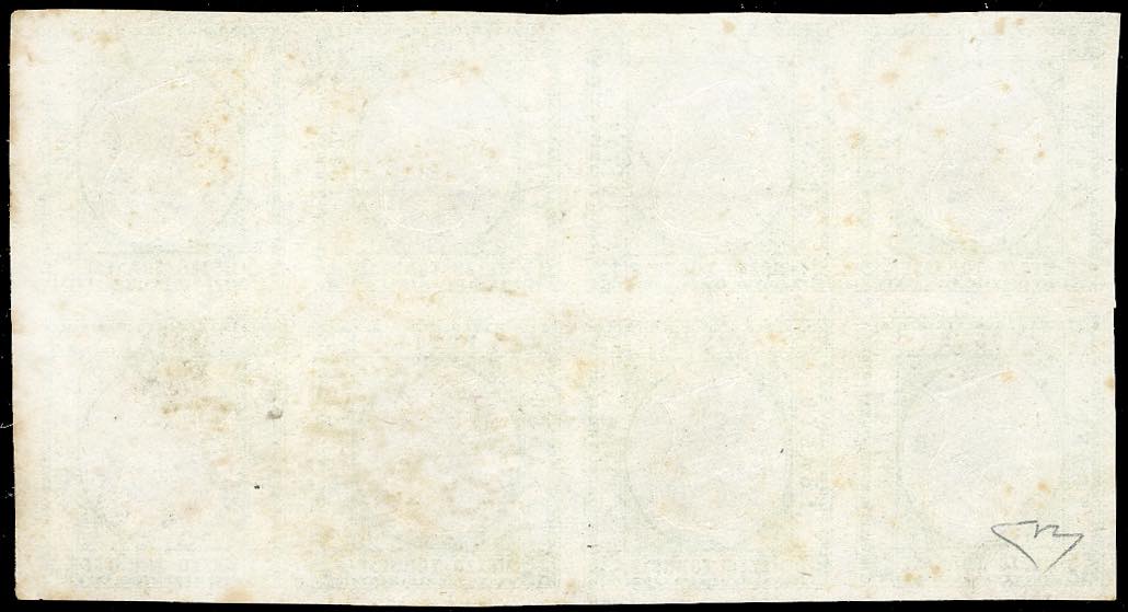 1861 - 1/2 tornese verde giallo, effigie capovolta (17g), blocco di otto esemplari, lievi ossidazioni, senza gomma come sempre. Rarità del settore, massimo multiplo noto di questa varietà. INSIEME UNICO! Cert. E.Diena.