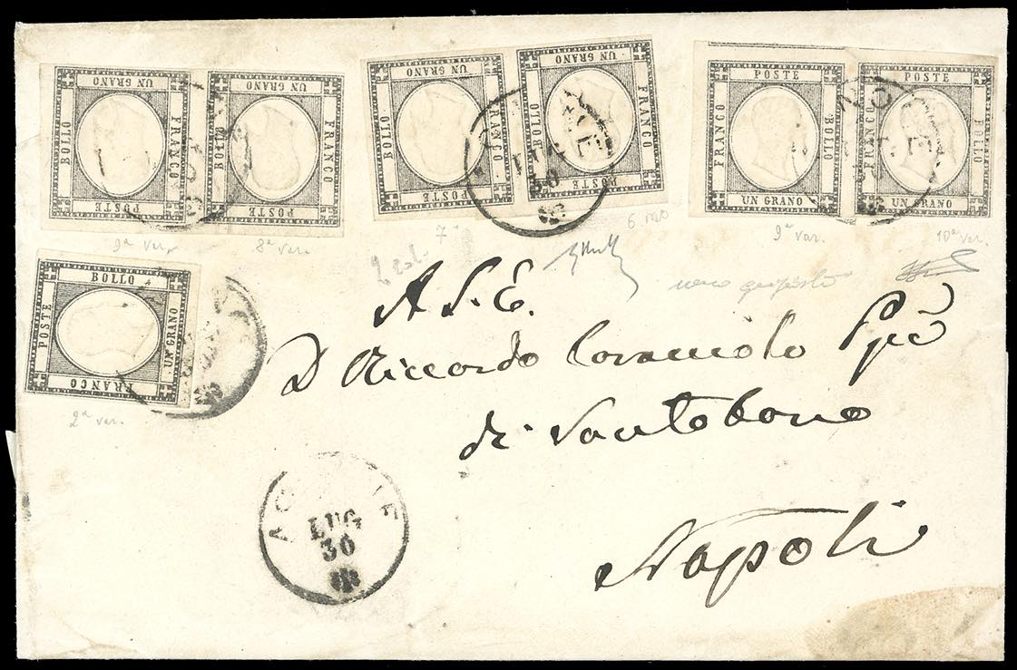 1861 - 1 grano grigio nero (19a), un singolo e tre coppie di tinte differenti, perfetti, margini da ampi a giusti, su lettera da Agnone 30/7/1861, giorni invertiti al posto dell'anno nel bollo datario, a Napoli. Rara affrancatura multipla monovalore. Chiavarello, cert. Ferrario. Ex coll. Imperato.