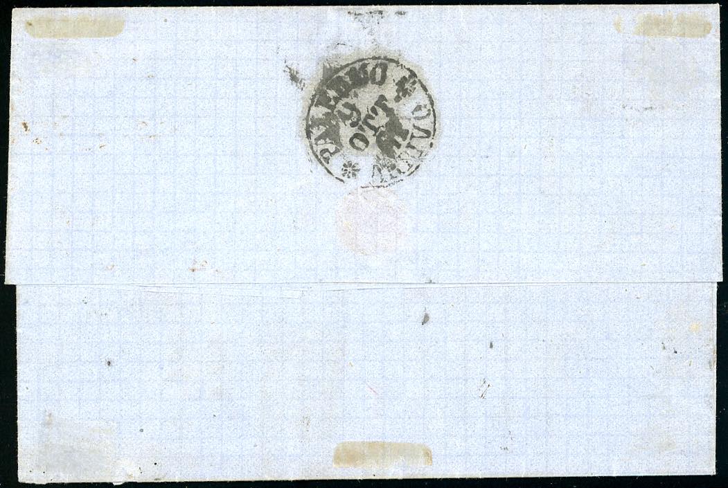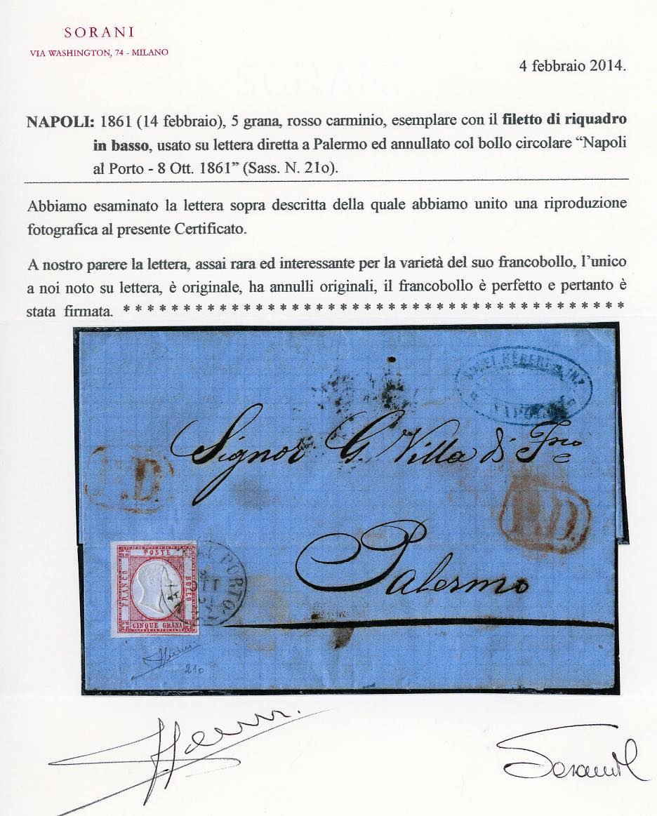 1861 - 5 grana rosso carminio, filetto di inquadratura in basso (21o), ottimo stato, su lettera da Napoli 8/10/1861 a Palermo. Varietà ... Leggi tutto