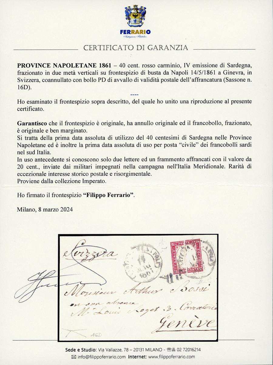 1861 - 40 cent. rosso carminio, IV emissione di Sardegna, FRANCOBOLLO FRAZIONATO IN DUE META' VERTICALI (verosimilmente separate per errore), ricomposte a formare nuovamente l'esemplare necessario per l'affrancatura (16D), su frontespizio di lettera da Napoli 14/5/1861 a Ginevra, in Svizzera, bollo PD coannullatore, ad ulteriore avallo della validità postale dell'affrancatura. I francobolli della IV emissione di Sardegna vennero introdotti ufficialmente nelle Province Napoletane il 1° ottobre 1862. Si tratta della PRIMA DATA ASSOLUTA DI UTILIZZO DEL 40 CENTESIMI NELLE PROVINCE NAPOLETANE ed è inoltre la PRIMA DATA ASSOLUTA DI USO PER POSTA "CIVILE" DEI FRANCOBOLLI SARDI. In uso antecedente si conoscono solo due lettere ed un frammento affrancati con il valore da 20 cent., inviate dai militari impegnati nella campagna nell'Italia Meridionale. Rarità di eccezionale interesse storico postale e risorgimentale. A.Diena, Chiavarello, cert. Ferrario e dettagliato cert. AIEP Bottacchi. Ex coll. Imperato.
