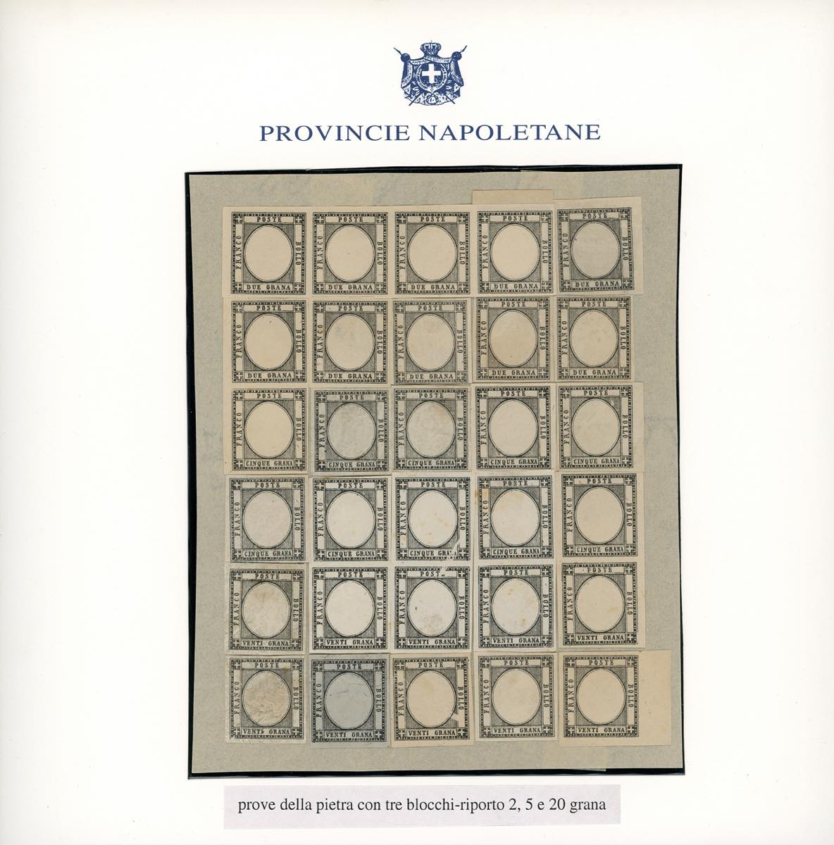 1861 - Prova della pietra in nero con tre blocchi-riporto ricomposti, dieci esemplari da 2 grana, dieci da 5 grana e dieci da 20 grana, su ... Leggi tutto
