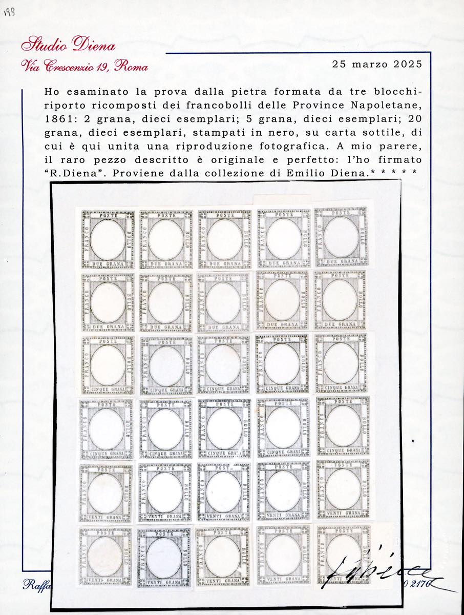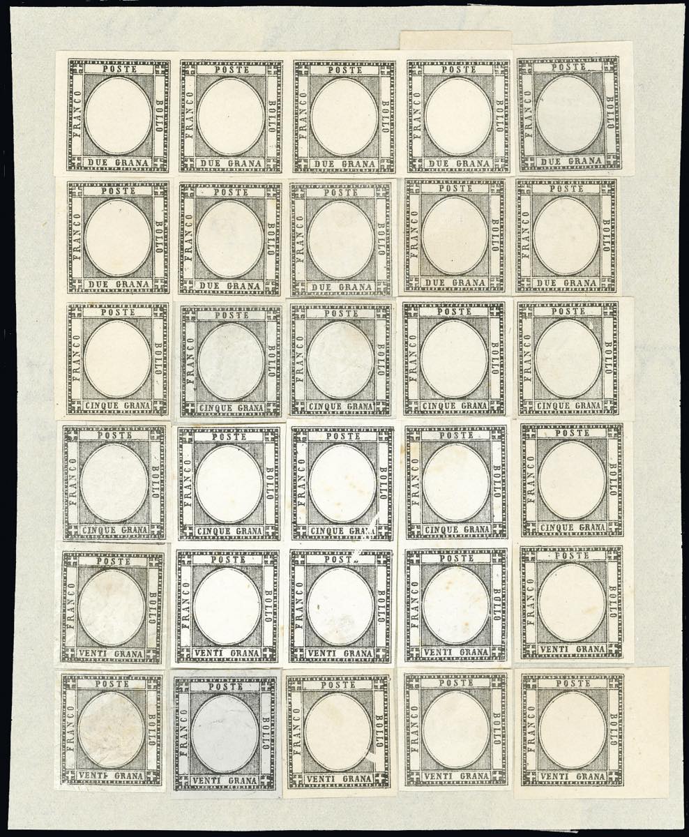 1861 - Prova della pietra in nero con tre blocchi-riporto ricomposti, dieci esemplari da 2 grana, dieci da 5 grana e dieci da 20 grana, su carta sottile, senza effigie, senza gomma, perfetta. Estremamente rara, insieme probabilmente unico. Cert. Diena. Ex coll. Emilio Diena.