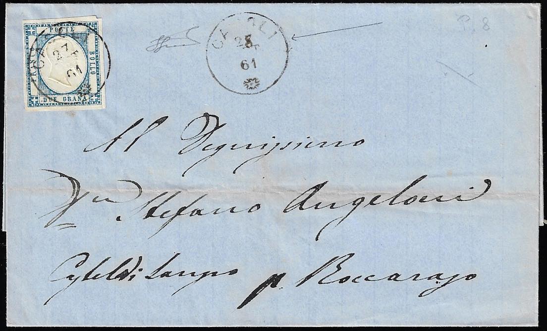 CASOLI, cerchio piccolo punti 8 - 2 grana (20b), perfetto, su sovracoperta di lettera del 28/9/1861, giorno corretto a penna, a Roccaraso. Ferrario.