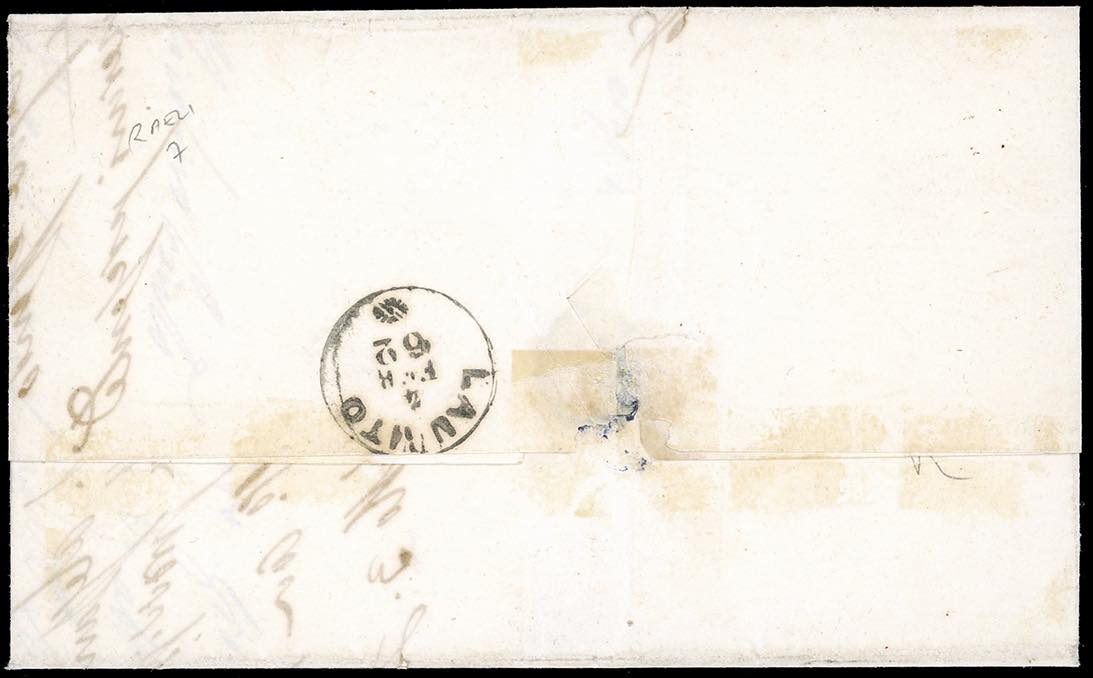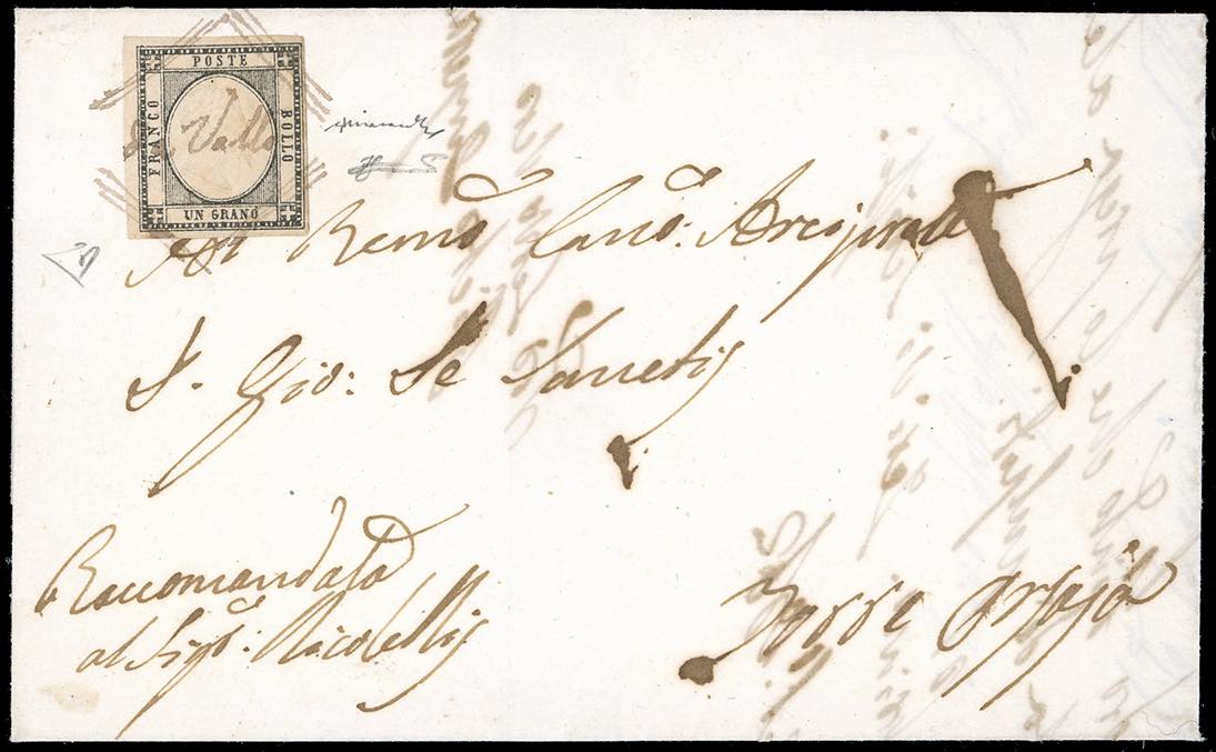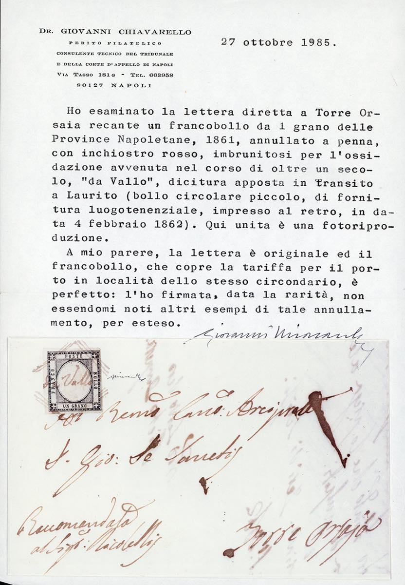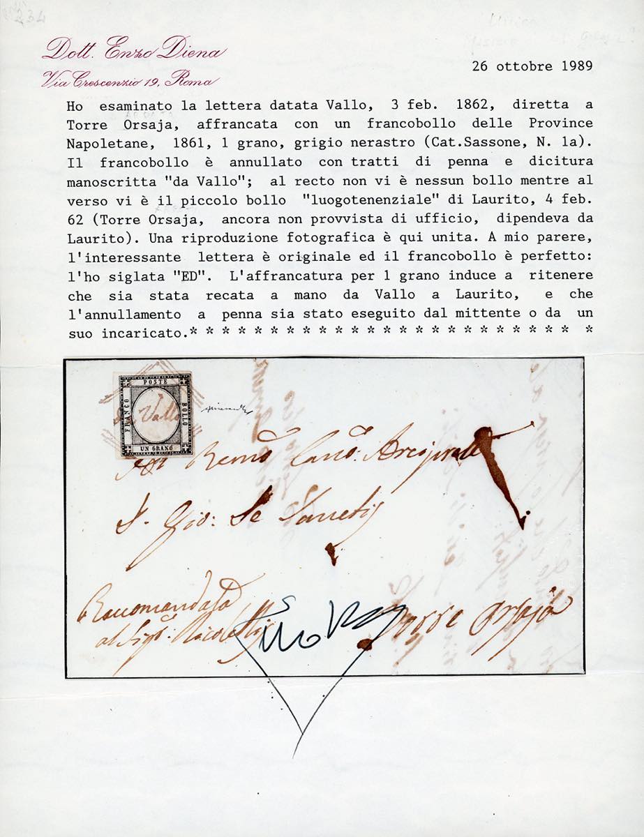 VALLO, a penna non catalogato - 1 grano grigio nero (19a), perfetto, isolato su lettera per distretto per Torre Orsaia, al verso transito di Laurito 4/2/1862, da cui dipendeva la località d'arrivo. Il francobollo venne annullato con la dicitura manoscritta "da Vallo" e diversi tratti simmetrici di penna ai quattro angoli. UNICA LETTERA NOTA, spettacolare e non catalogata. Ferrario, cert. E.Diena e Chiavarello. Ex coll. Imperato.