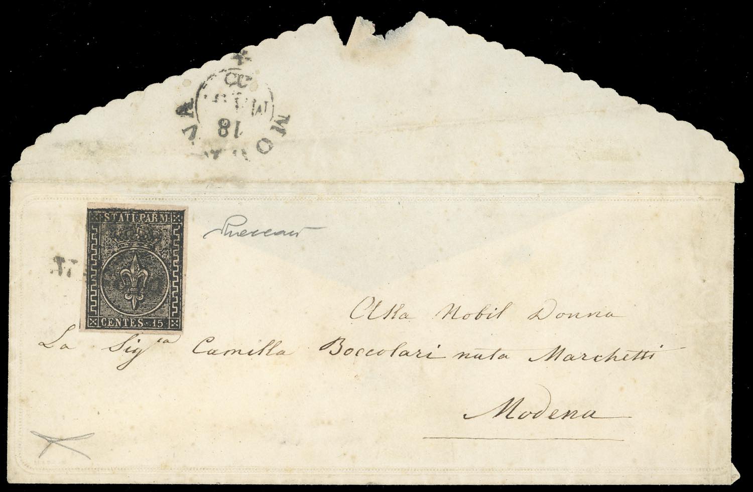 1855 - 15 cent. rosa (3), perfetto e ben marginato, su busta fortemente decorata a secco da Parma a Modena 18/5/1855. Estremamente rare le buste "valentine" dal Ducato di Parma. Bottacchi, Vaccari.