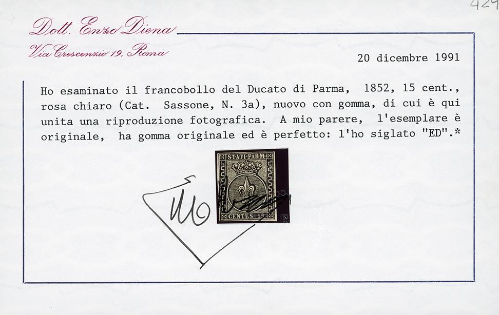 1852 - 15 cent. rosa chiaro (3a), nuovo, gomma originale, perfetto e molto fresco. Raro. A.Diena, cert. E.Diena.