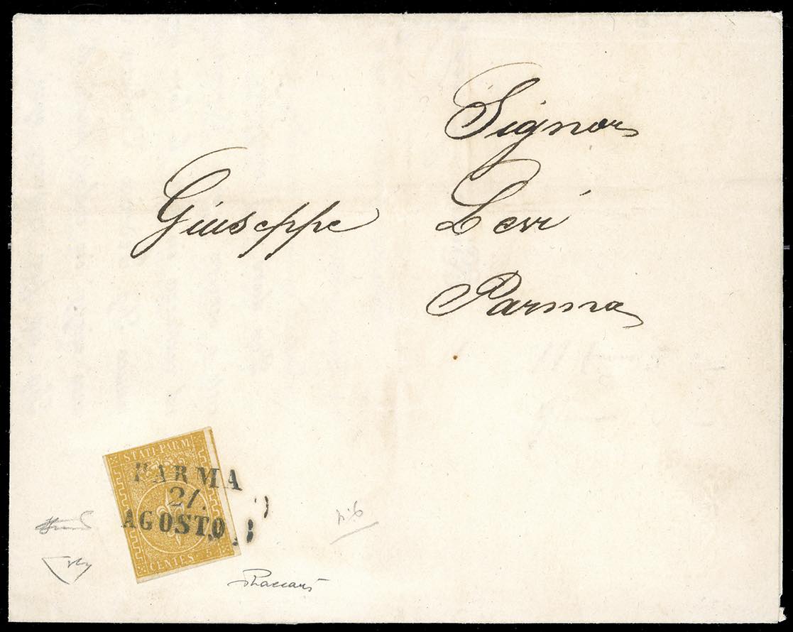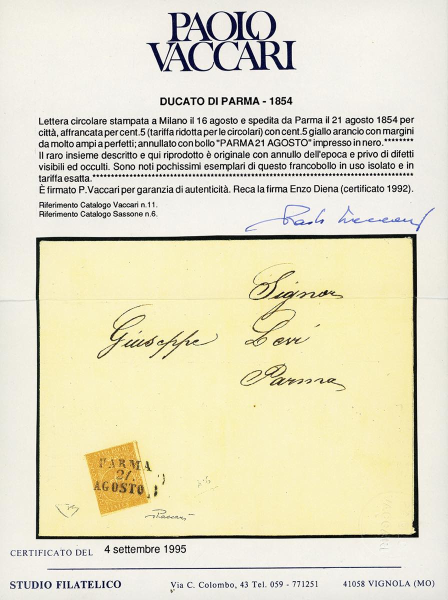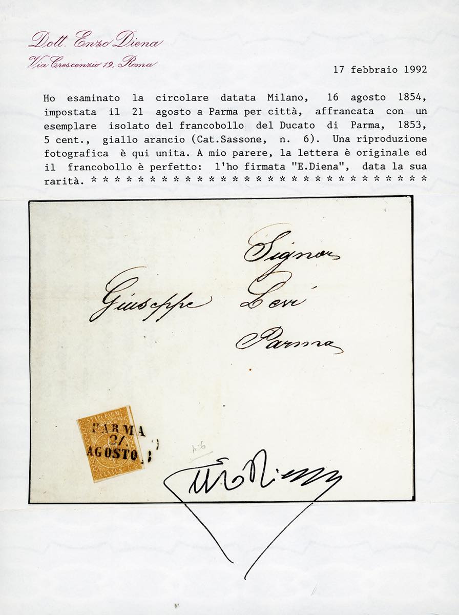 1854 - 5 cent. giallo arancio, seconda emissione (6), perfetto, margini completi da tutti i lati, isolato su freschissima circolare da Parma 21/8/1854 per città. La circolare fu stampata a Milano, con data interna 16 agosto e trasportata privatamente a Parma per l'inoltro. Qualità eccezionale e rarissimo uso isolato di questo francobollo, di cui si conoscono solo pochissimi altri casi. Cert. Ferrario, Vaccari, Enzo Diena.