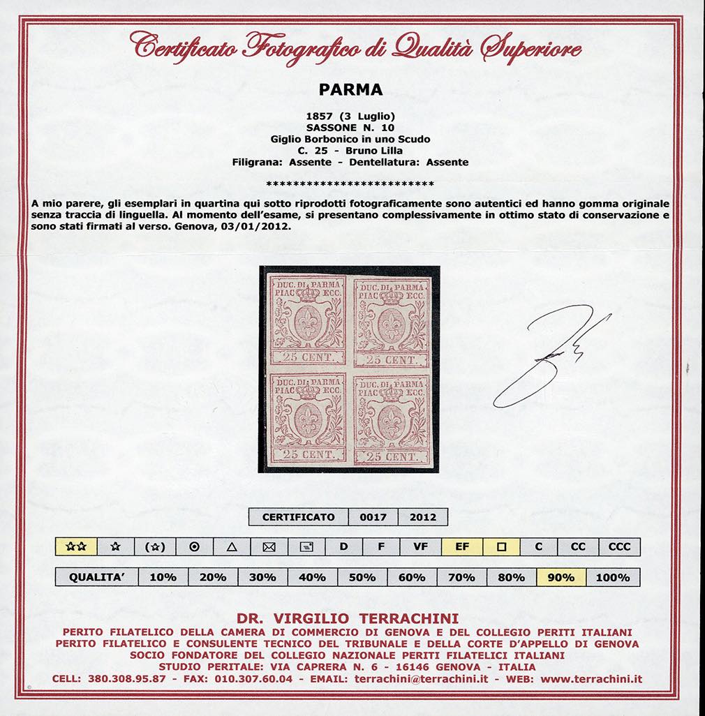 Lotto 308 - 1857 - 25 cent. bruno lilla (10), blocco di quattro ...