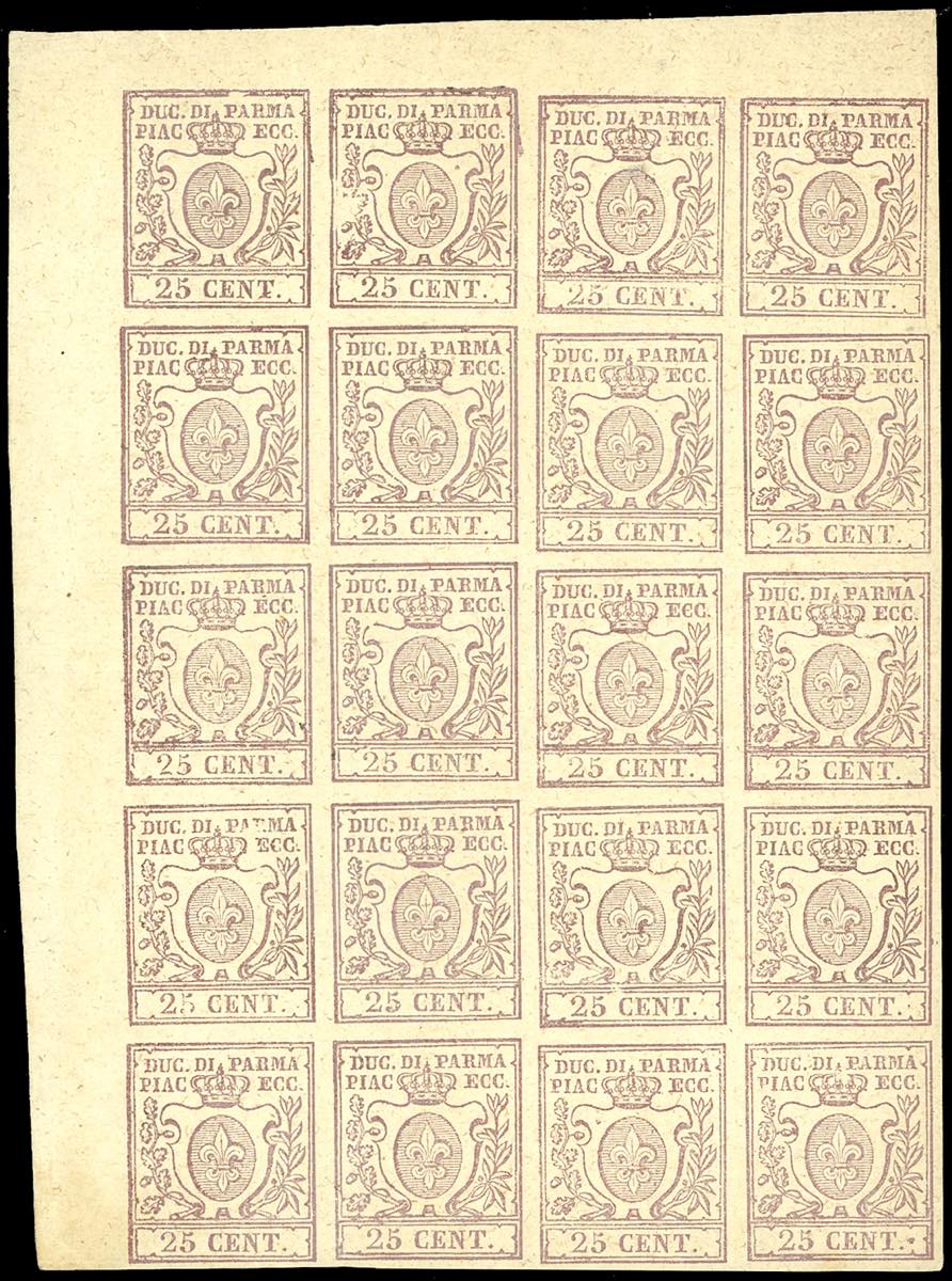 1857 - 25 cent. bruno lilla (10), blocco di venti esemplari, angolo di foglio, nuovo, gomma originale integra, minima traccia di linguella per un solo esemplare, perfetto e molto fresco. Estremamente raro e di ottima qualità. Emilio Diena, G.Oliva e cert. Alberto Diena.