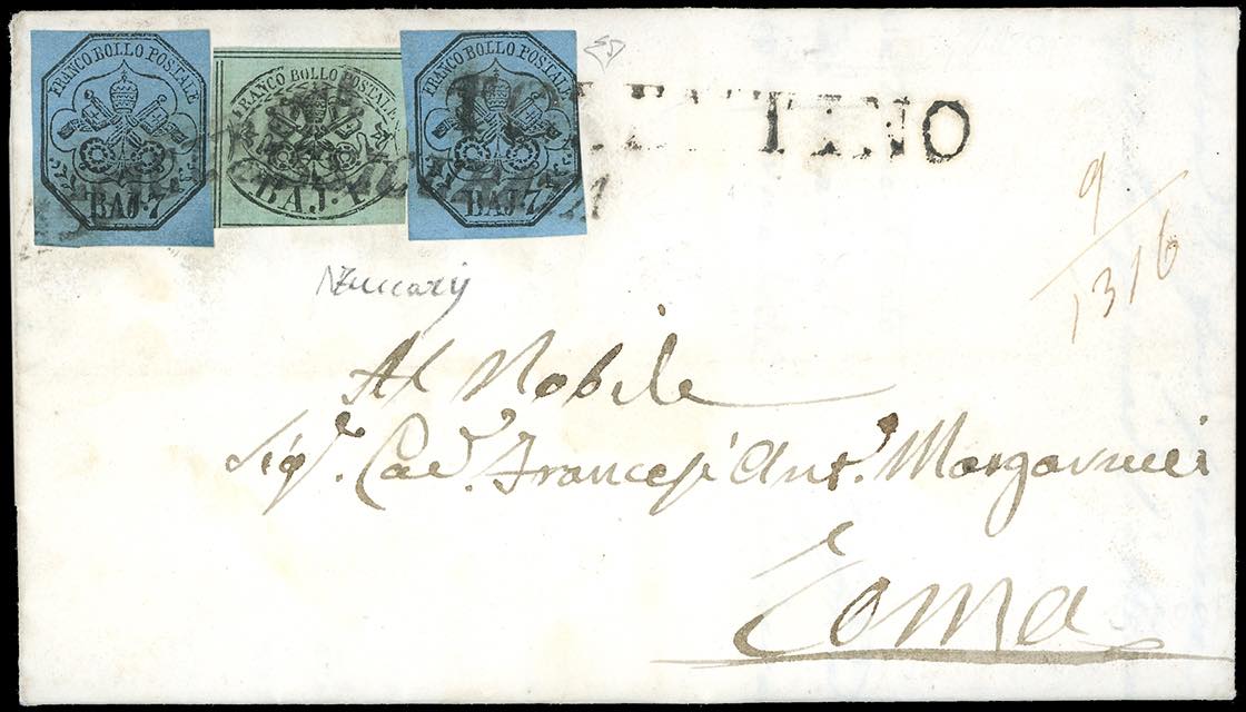 1853 - 1 baj verde grigiastro, 7 baj azzurro, due esemplari (2,8), in affrancatura bicolore "a bandiera", su fresca lettera assicurata da San Severino 22/8/1853, lineare "assicurata" annullatore (punti 8), a Roma. Ottimo aspetto. E.Dinea, Zuccari.