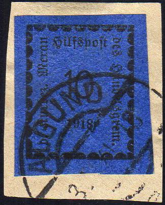 MERANO 1918 - 10 h. oltremare (3), perfetto, usato su piccolo frammento.