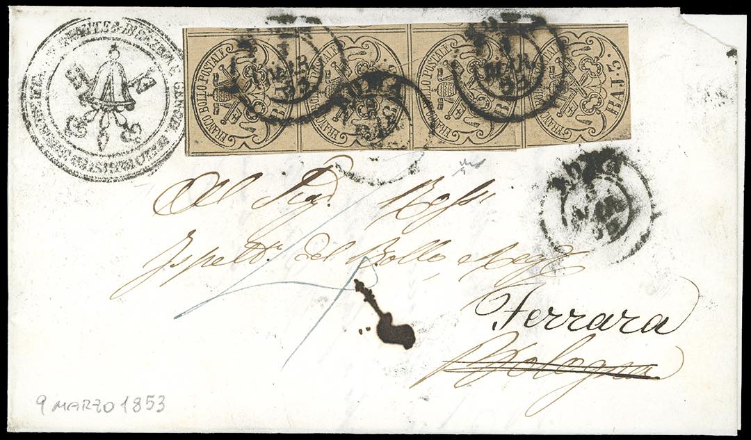 1853 - 3 baj bistro (4), striscia verticale di quattro, rasente in basso, su lettera di doppio porto da Roma 5/3/1853 a Bologna, rispedita ... Leggi tutto