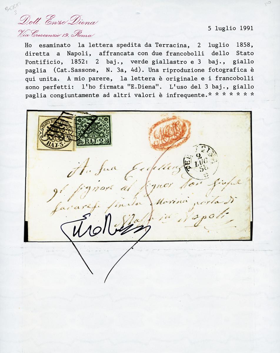 1858 - 3 baj giallo paglia, filetti completi sui quattro lati, 2 baj verde giallastro (4d,3a), perfetti, su fresca lettera da Terracina 2/7/1858 a Napoli, tassata 5 grana, bollo AGDP in rosso. Pregevole l'uso di questa rara tinta del 3 baj con altri valori, di splendida qualità. Cert.Diena.