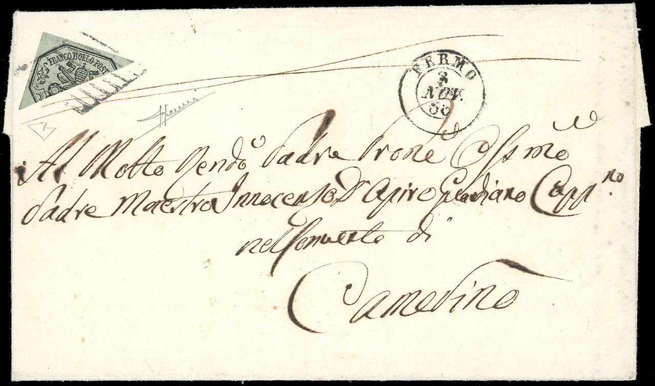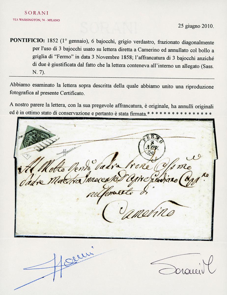 1856 - 6 baj grigio verdastro (7), frazionato diagonalmente a metà, perfetto e ben marginato nei lati non interessati dal taglio, su fresca lettera da Fermo 3/11/1856 a Camerino. Rara e di ottima qualità. Cert. E.Diena e Sorani.