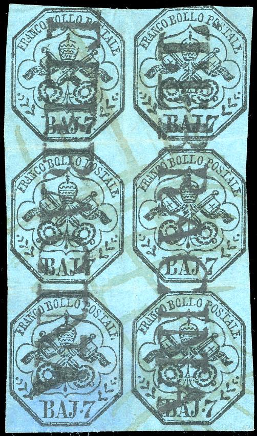 1852 - 7 baj azzurro (8), blocco di sei, due margini sfiorati/leggermente intaccati, usato a Terracina. Pregevole blocco con annullo lineare. Ferrario. Ex coll. Imperato. (cat. Sassone ca € 7.500)