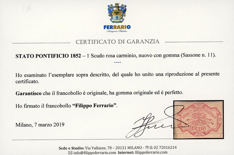 1852 - 1 scudo rosa carminio (11), gomma originale, perfetto, grandi margini. G.Bolaffi, A.Diena, cert. Ferrario.