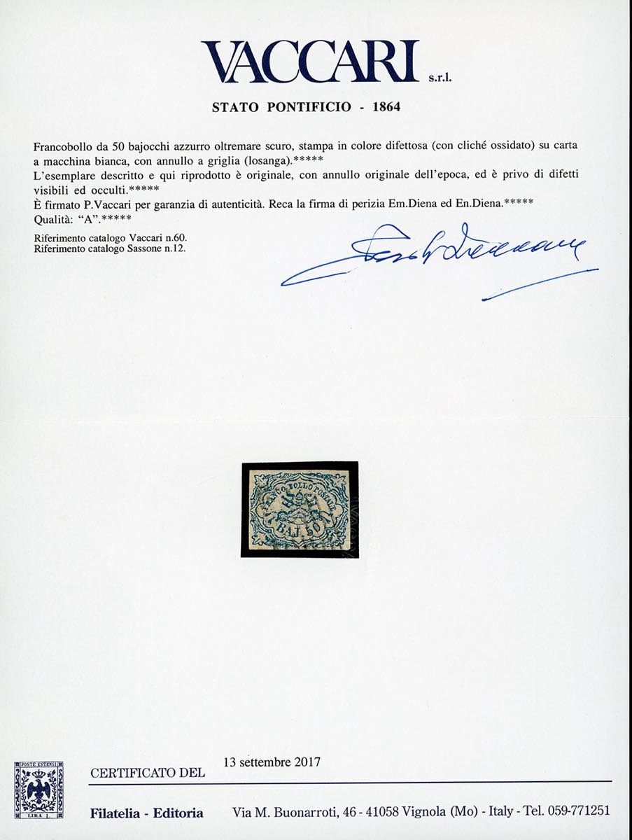 1864 - 50 baj azzurro oltremare scuro (12), usato, perfetto e ben marginato. Raro e di ottima qualità. Em. ed E.Diena, Ferrario, cert. Vaccari.