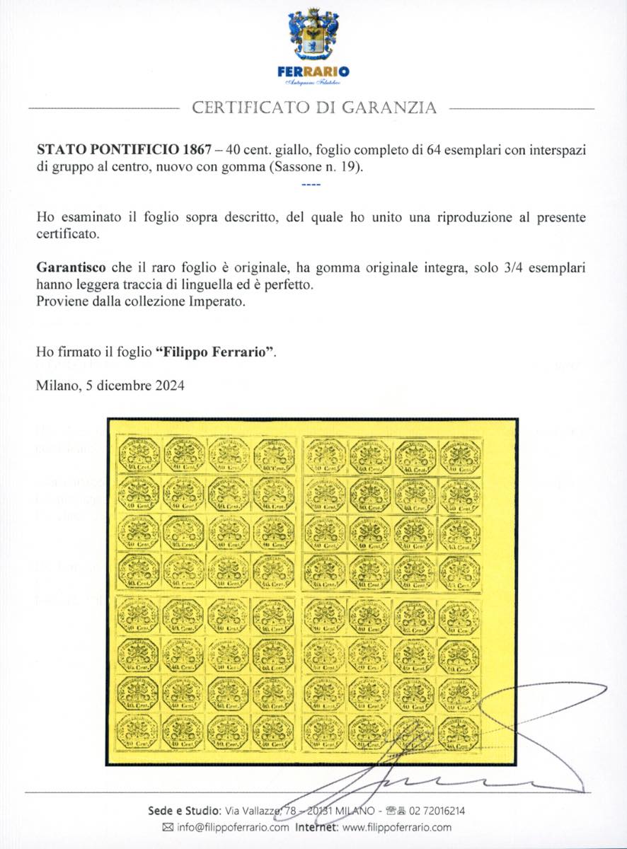 1867 - 40 cent. giallo (19), foglio completo di 64 esemplari con interspazi di gruppo al centro, gomma originale integra, solo 3/4 esemplari con leggera traccia di linguella, perfetto. Raro e molto bello. A.Bolaffi senior, Em.Diena, cert. A.Diena e Ferrario. Ex coll. Imperato.