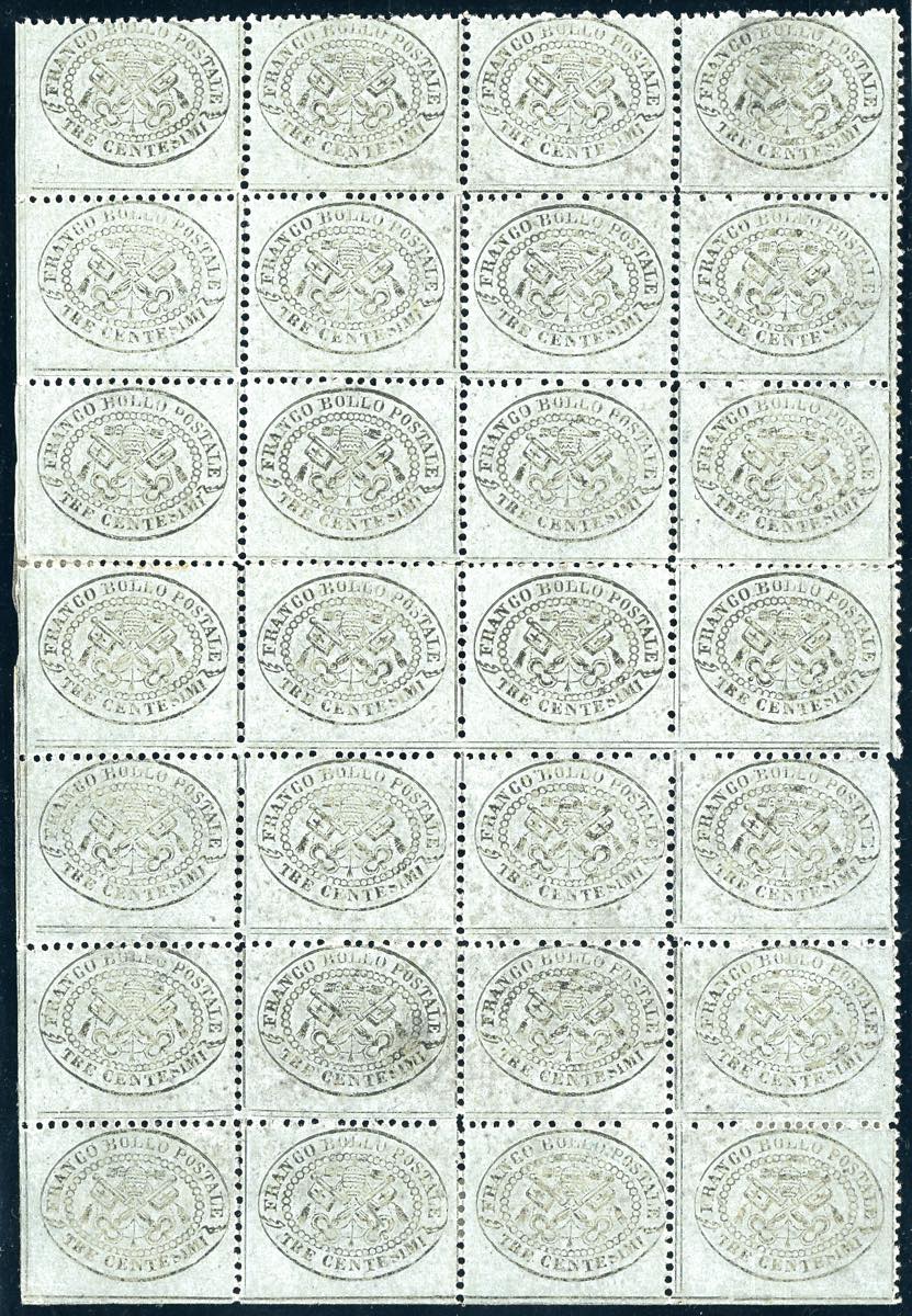 1868 - 3 cent. grigio (24), blocco di 28 esemplari, angolo di foglio, gomma originale integra, traccia di linguella su otto esemplari, ... Leggi tutto