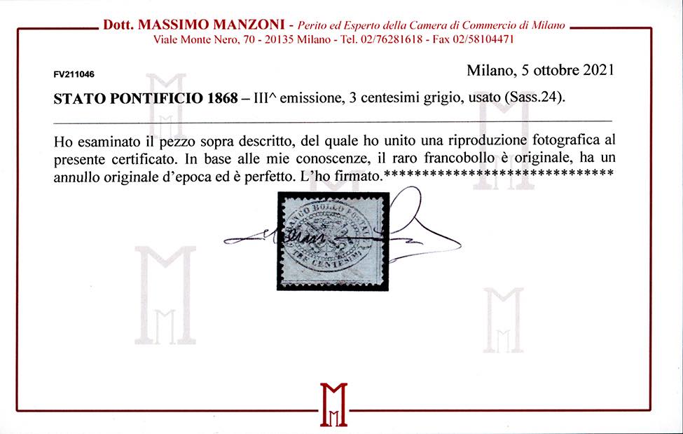 1868 - 3 cent. grigio (24), usato, perfetto. Raro. A.Diena, cert. Manzoni.