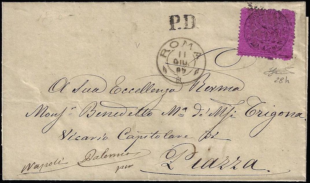 1869 - 20 cent. violetto rosso (28h), perfetto, isolato su fresca lettera da Roma 11/6/1869 a Piazza Armerina in Sicilia. Molto bella. ... Leggi tutto