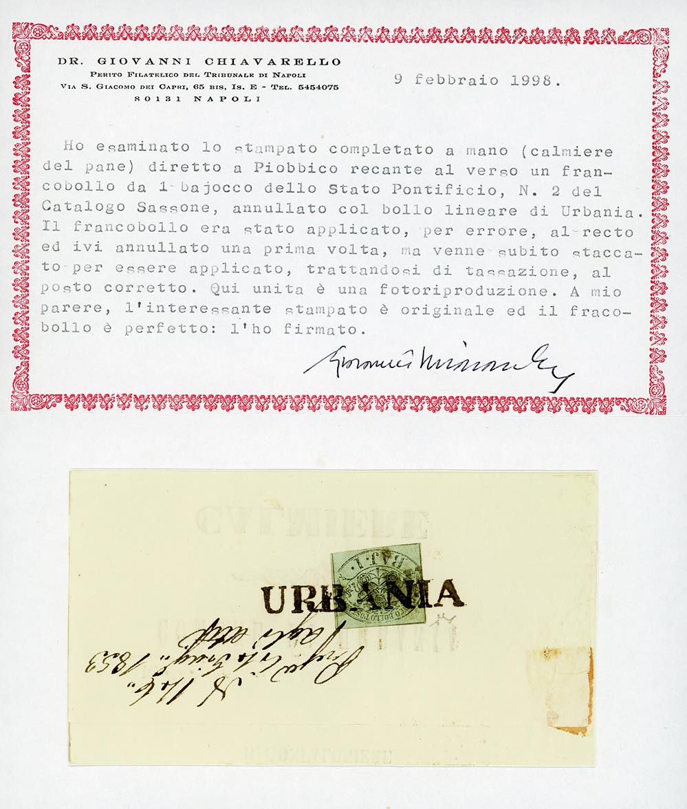 URBANIA, SD punti 13 - 1 baj (2), perfetto, al verso di lettera in porto assegnato datata internamente 1/6/1853 per Piobbico, tassa sul fronte 1. Il francobollo venne inizialmente applicato sul fronte e annullato, ma venne subito staccato per essere riapplicato e nuovamente annullato al verso, trattandosi di un invio in porto assegnato. Rara e molto interessante. Cert. Chiavarello e Ferrario.