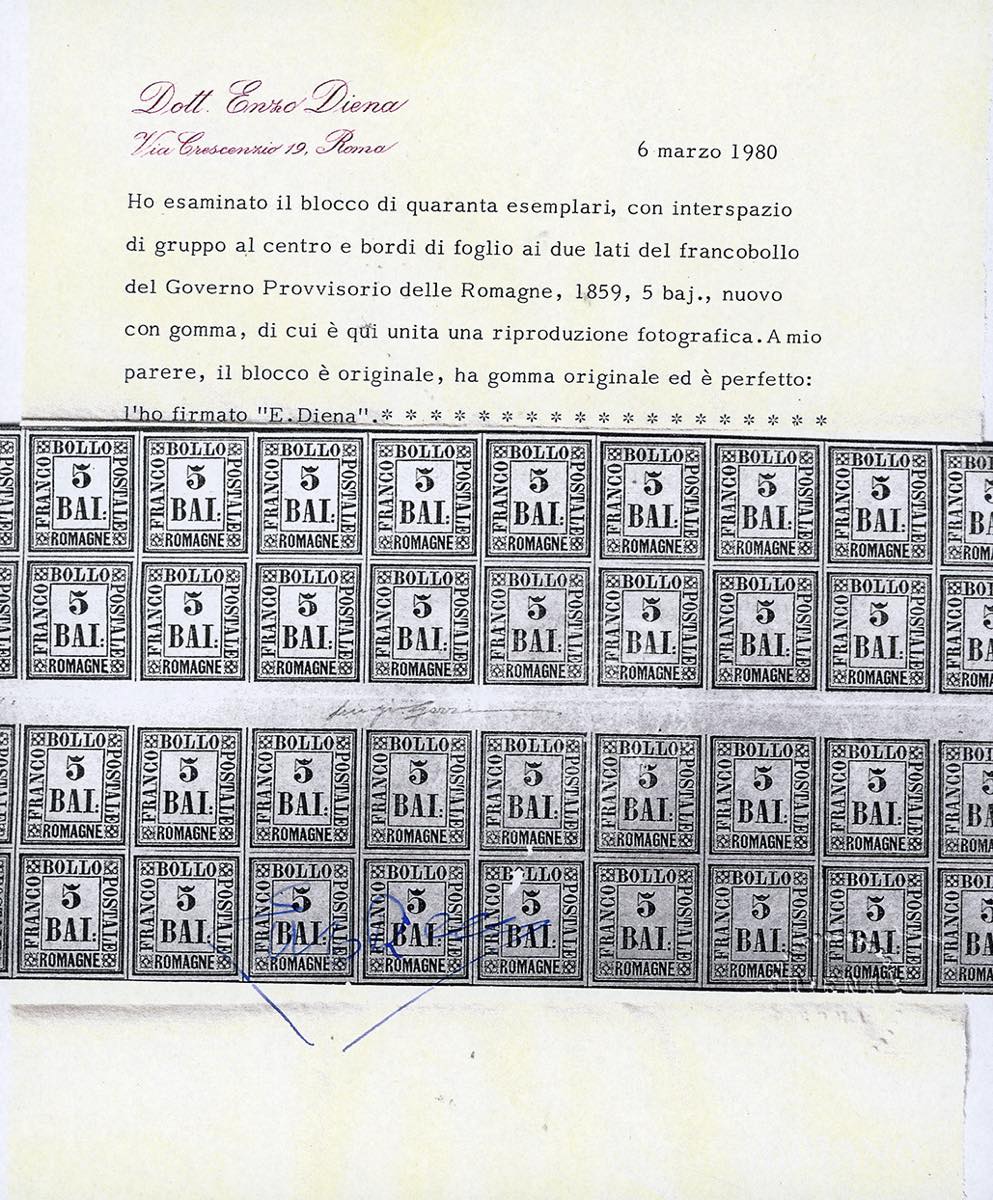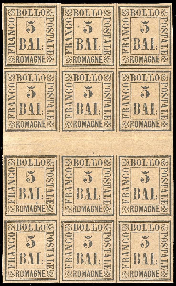 1859 - 5 baj violetto (6), blocco di 12 esemplari con interspazio di gruppo al centro, nuovo, gomma originale integra, perfetto. Giulio Bolaffi per esteso, fotocopia cert. E.Diena del blocco di provenienza.