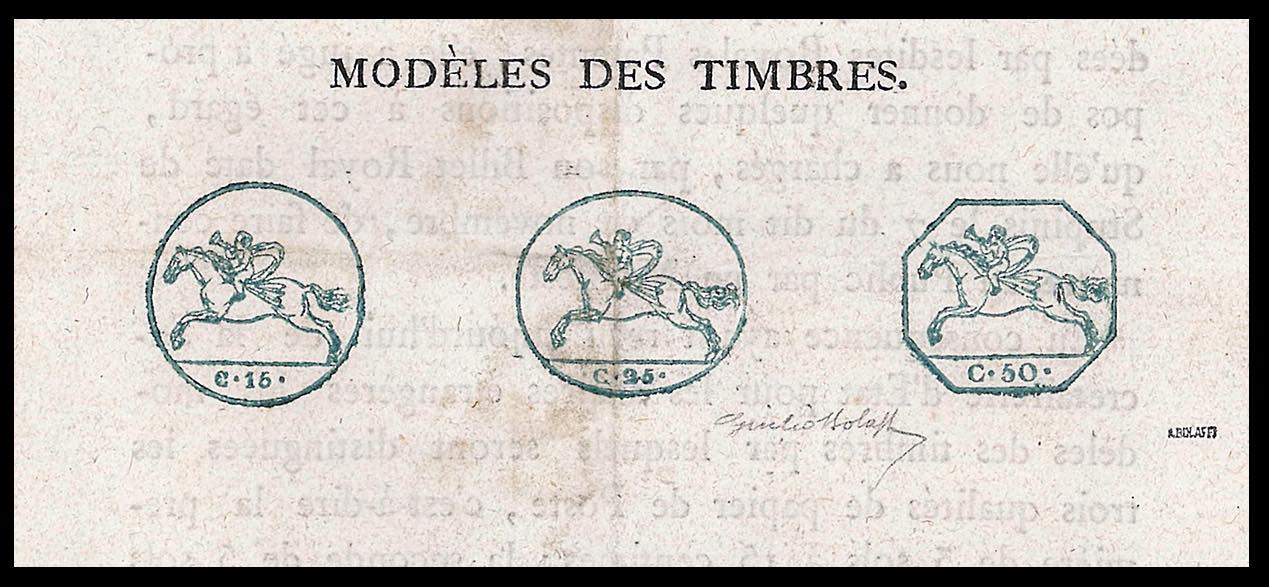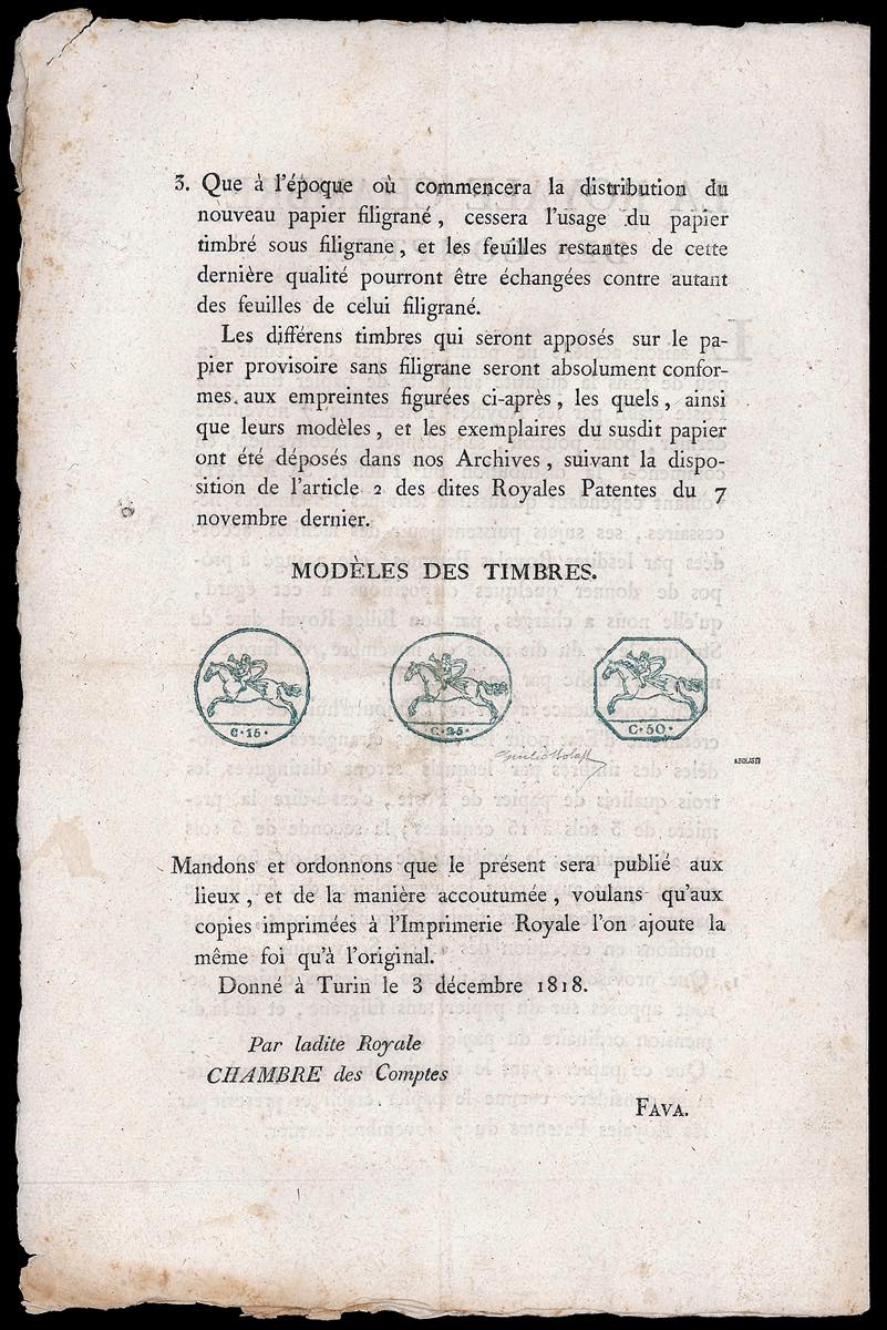 1818 - Manifesto camerale del 3/12/1818 in lingua francese, con le impronte dei tre Cavallini a stampa. Molto raro. Giulio Bolaffi per esteso.