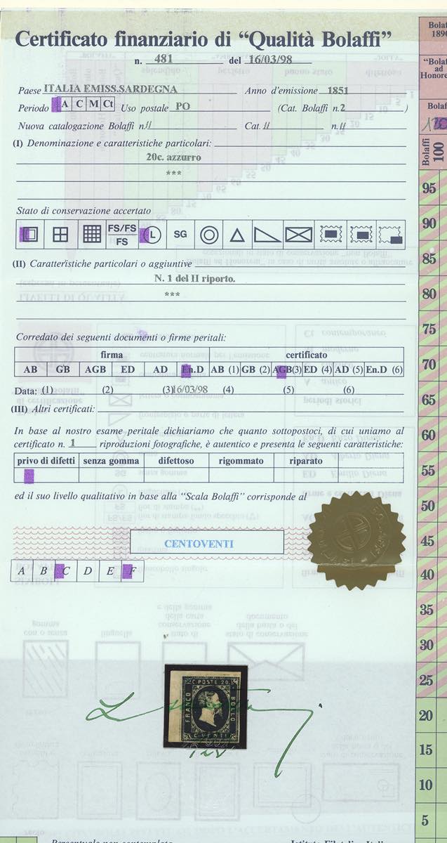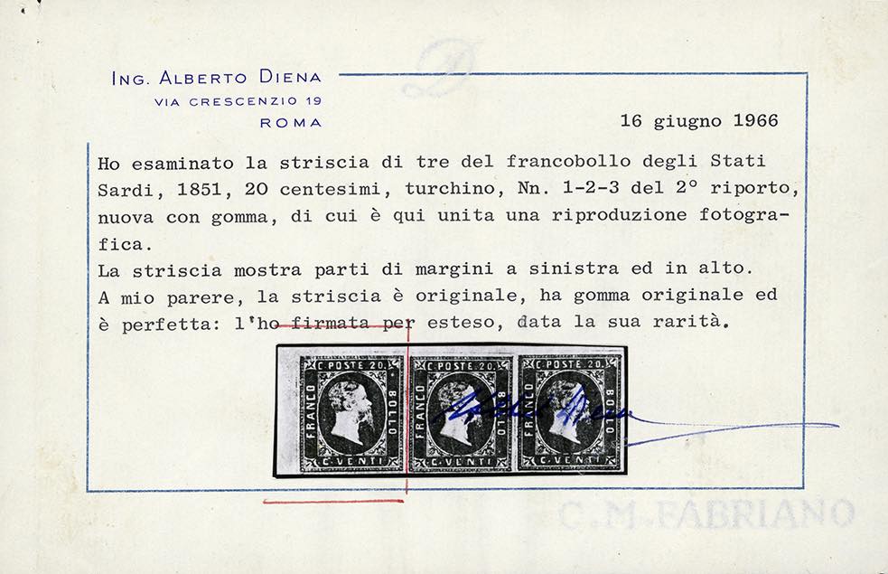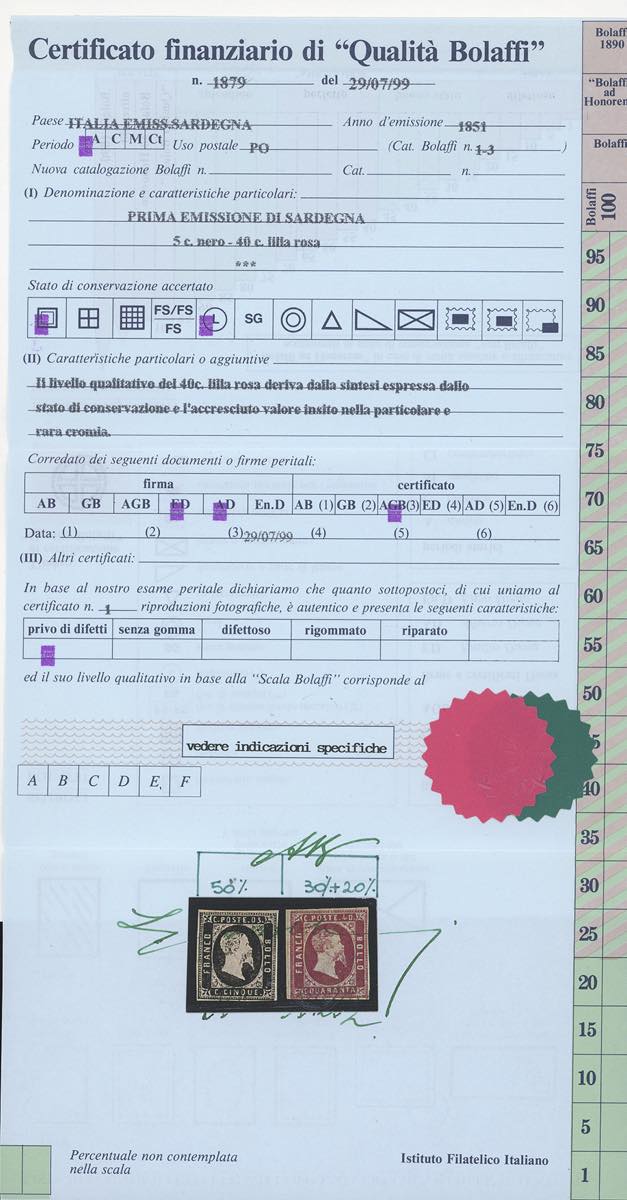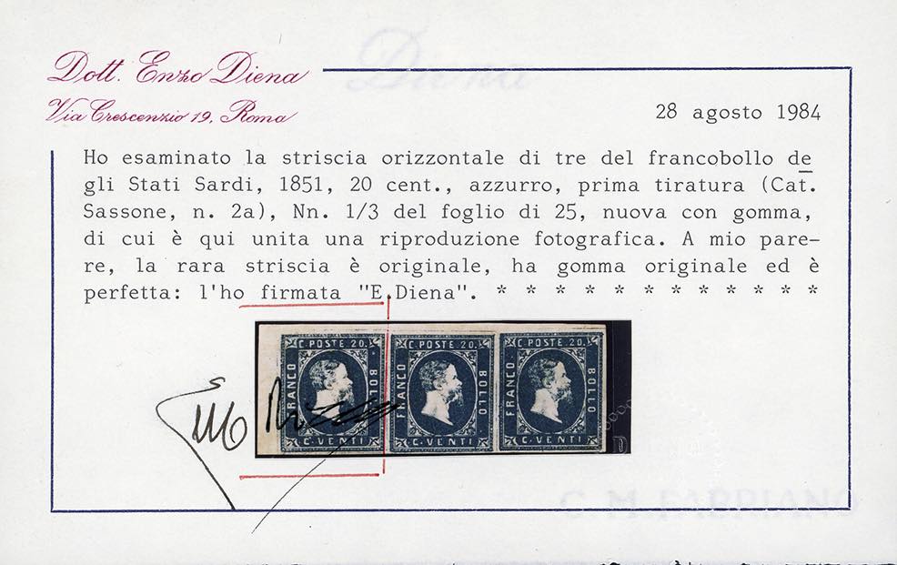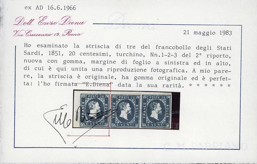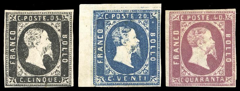 1851 - Prima emissione, serie completa (1/3), nuovi, gomma originale, perfetti. Il 20 cent., angolo di foglio, è eccezionale; il 40 cent. è dell'interessante tinta lilla rosa (3c). Insieme estremamente raro, di ottima qualità complessiva. Cert. finanziario Bolaffi per tutti, il 5 cent. firmato Colla, il 20 cent. cert. Alberto ed Enzo Diena, il 40 cent. firmato Emilio ed Alberto Diena, Colla e Fiecchi.