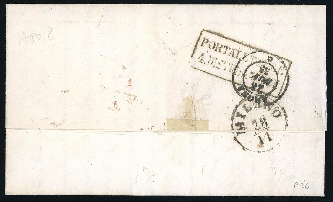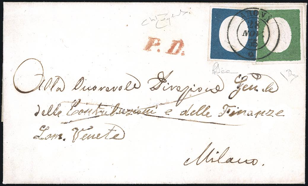1855 - 5 cent. verde, 20 cent. azzurro (7,8), perfetti e ben marginati, su lettera da Arona 28/11/1855 a Milano, bollo P.D. rosso. ... Leggi tutto
