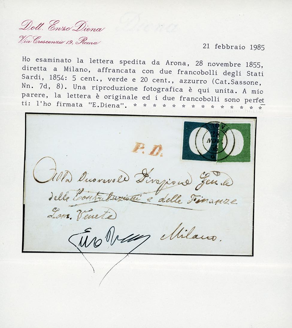 1855 - 5 cent. verde, 20 cent. azzurro (7,8), perfetti e ben marginati, su lettera da Arona 28/11/1855 a Milano, bollo P.D. rosso. Splendida e di eccezionale freschezza. R.Diena, Raybaudi, cert. E.Diena.