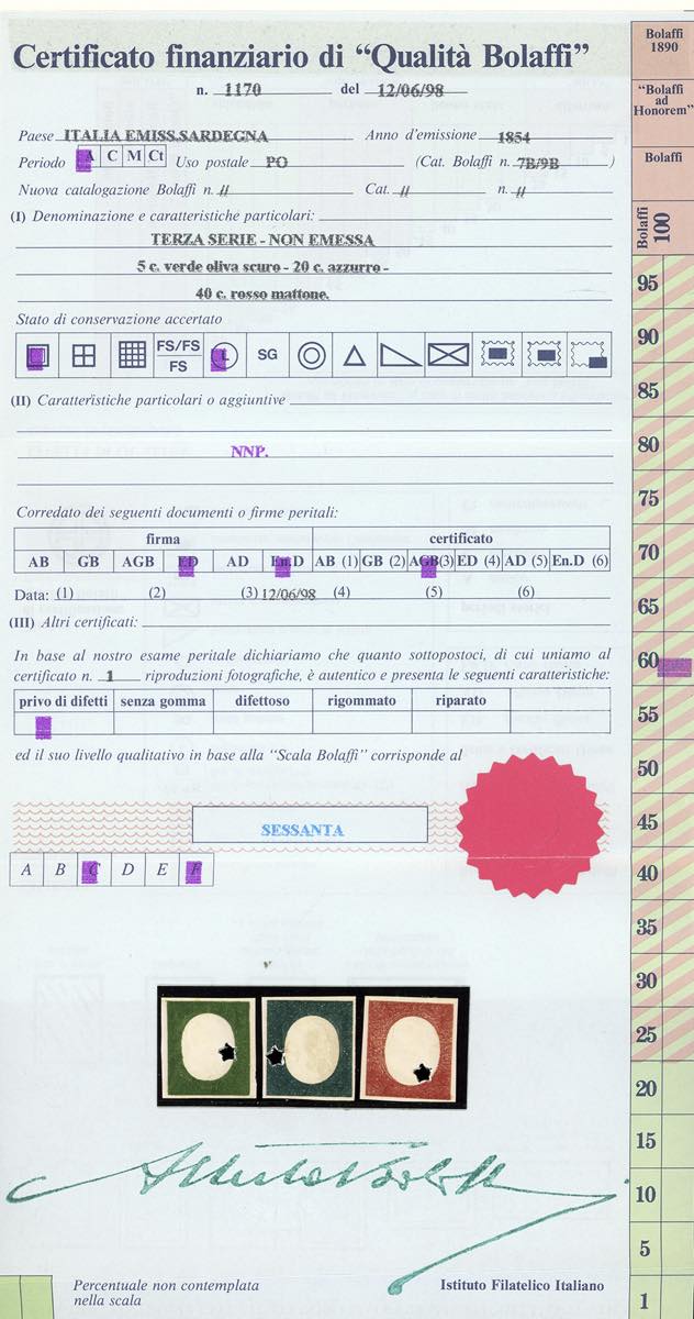 1854 - Terza emissione, non emessi, serie completa (10/12), nuovi, gomma originale integra, perfetti. Cert. finanziario Bolaffi 60% per la serie, il 5 cent. firmato Emilio ed Enzo Diena.