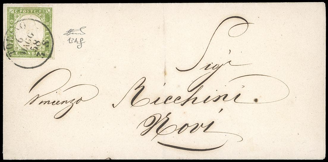 1858 - 5 cent. verde giallo chiaro (13Af), perfetto, ampi margini, isolato su fresca lettera contenente stampati, da Torino 6/5/1858 a ... Leggi tutto